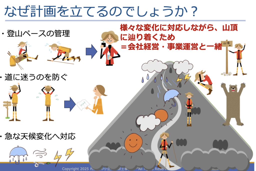 セミナーでは、経営計画を「登山計画」に例えて説明しました。