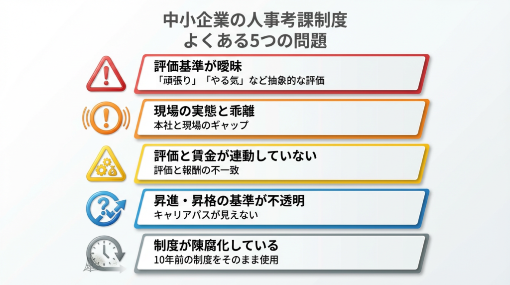 これらの問題の多くは、明確な人事考課制度がない、または形骸化していることが原因です。