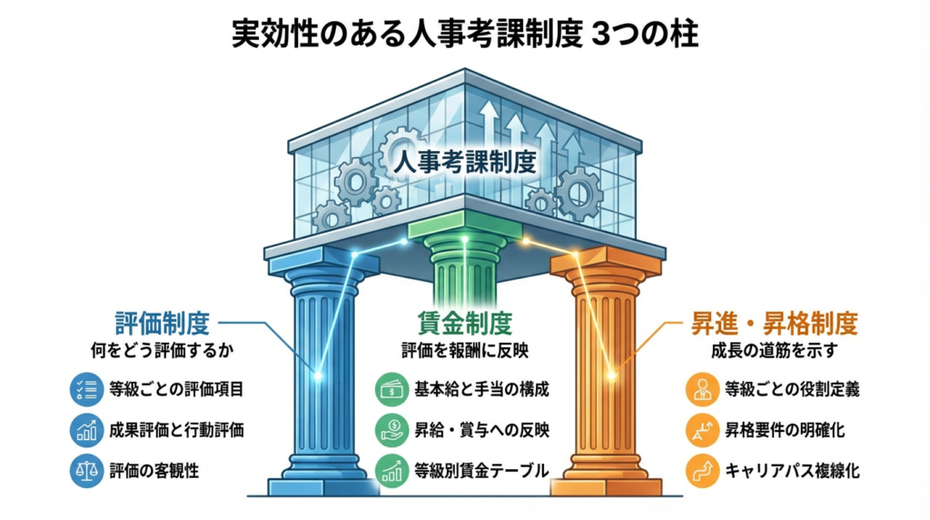 人事考課制度は、以下の3つが連動して初めて機能します。どれか1つだけを整備しても、効果は限定的です。