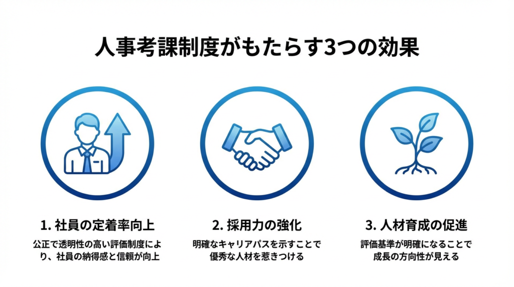 「評価されている」「成長している」「将来が見える」と感じる社員は、会社に定着します。特に優秀な社員ほど、正当な評価を求めます。彼らを引き留めるには、明確な評価制度が不可欠です。