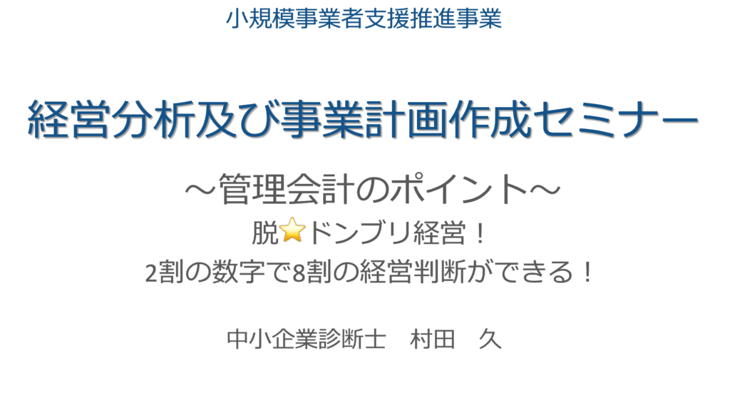先日事業者様を対象に行ったセミナーの記事を掲載しました。 記事の内容はこちらです。 脱★ドンブリ経営!2割の数字で8割の経営判断ができる管理会計のポイント こんにちは、村田久中小企業診断士事務所の村田です。 先日、小規模事業者の皆様向けに「経営分析及び事業計画作成セミナー」を開催させていただきました。 テーマは「脱★… 村田久中小企業診断士事務所 FacebookXBlueskyHatenaCopy